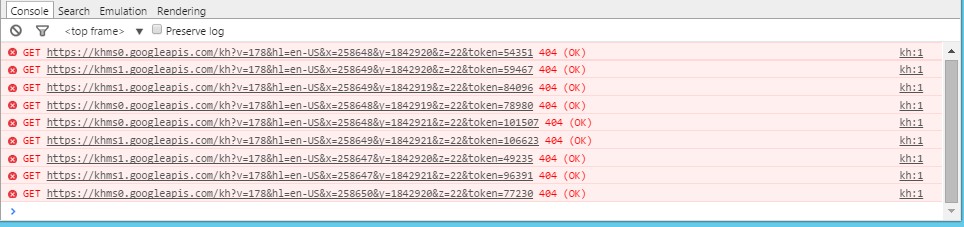问题: API试图在viewport中绘制所有标记。为了能够实现它,API计算缩放级别。使用单个标记,就像在您的示例中一样,它将使用最大缩放(似乎是22,注意坏URL中的z参数)。当API加载一个瓷砖时,它没有检查是否存在一个瓷砖(所以可能会发生请求返回404,这种情况经常发生)