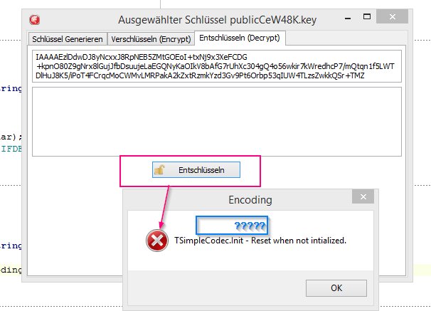 OP没有显示调用DecryptRSA_String()的外部级别代码。我猜他调用DecryptRSA_String()时,str的实际参数值为空。这将引发TSimpleCodec.Init Reset when not initalized异常。