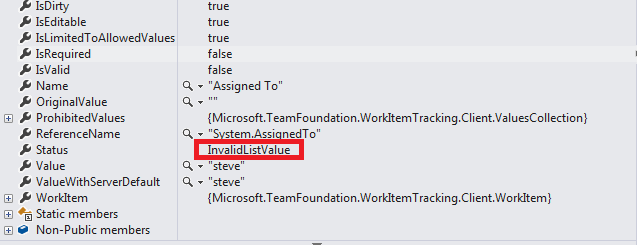 下面是这样的情况:我正在尝试创建一个任务WorkItem。我必须从dataGridView中获取数据,我认为这是我设法做到的。但是,当我尝试保存或验证WorkItem时,有趣的部分来了。无论State有什么值,验证器总是在执行wiTask.Validate();时附带InvalidListValue。我甚至尝试过对国家的价值进行严格的编码,但什么也没有发生。有一件事让我有点困扰--在验证数组中,错误出现在Status属性中,在该属性中,实际控件只有State可用。下面是一些代码和错误位的一个片段: