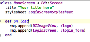 在on_load类的HomeScreen方法中,我想做一些类似于rmq.append(LoginScreen,:login_form)的事情。LoginScreen继承PM::FormScreen。