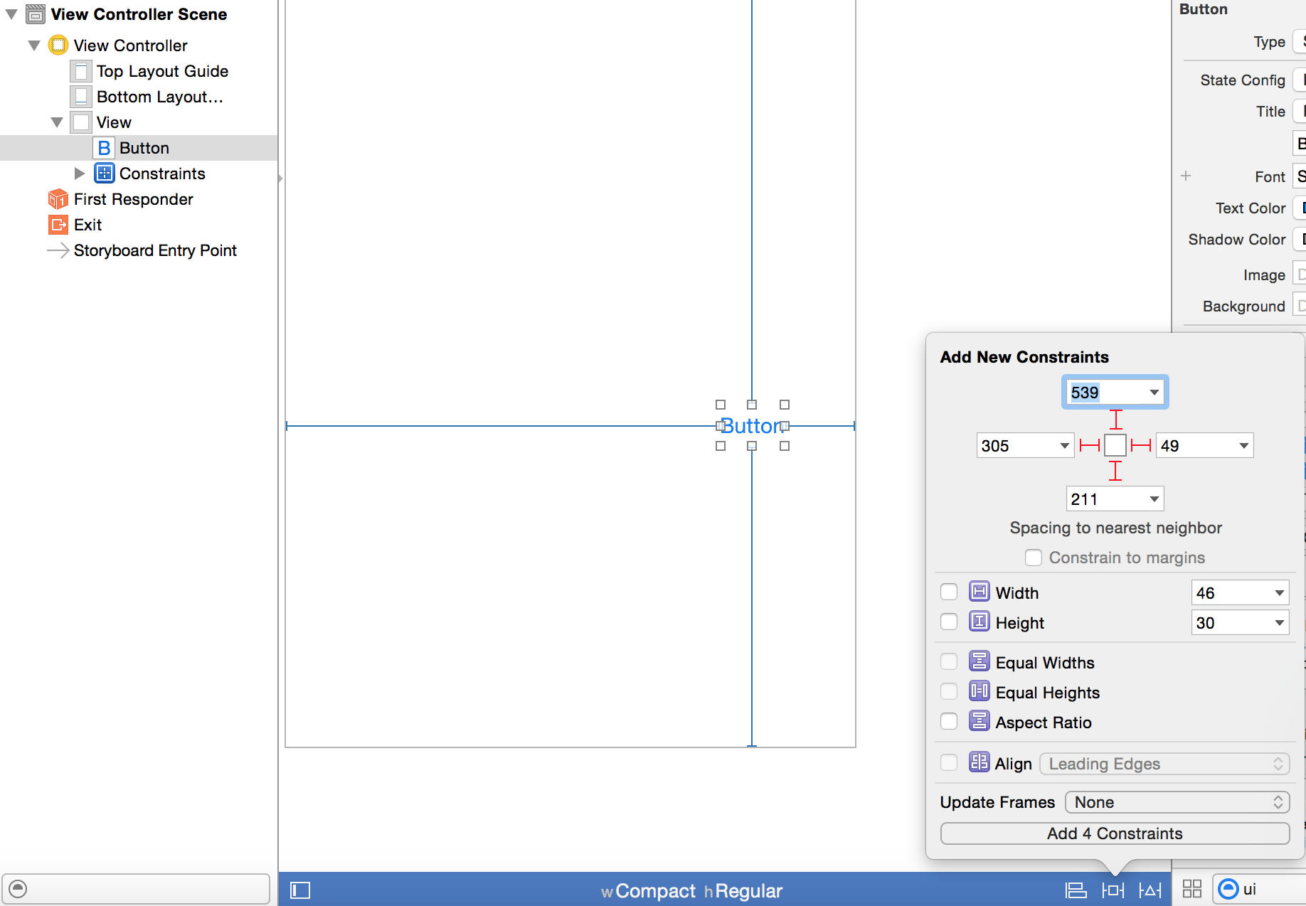 如果您有一个高度或宽度分配给按钮,它将与您添加的约束冲突。如果你想要它总是在一个特定的x,y和特定的大小,你应该钉在顶部和左边的宽度和高度。如果你想要它的动态调整大小,你应该钉所有4面。