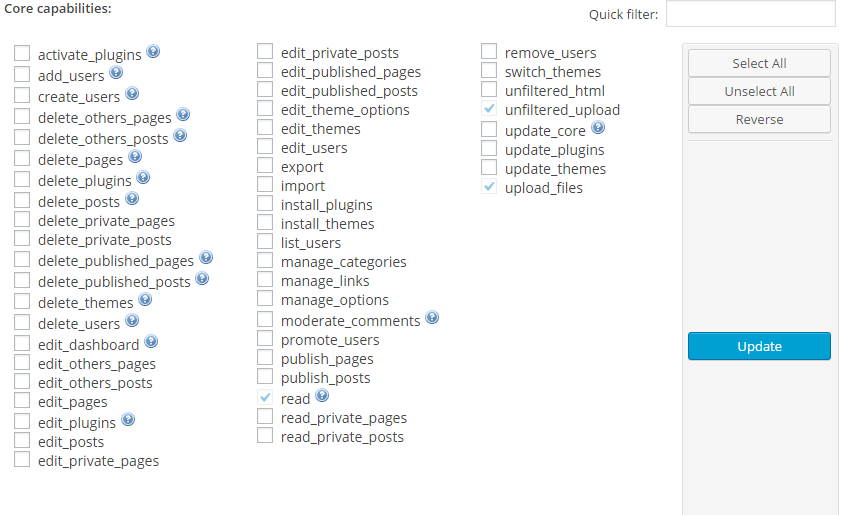 作为参考,这里有一个有用的表来帮助理解Wordress角色和功能:能力与角色表