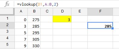 现在假设我有3作为给定的值。我想将它与A中的值范围进行比较,所以从逻辑上讲,它将降到3-4以下,并返回285。