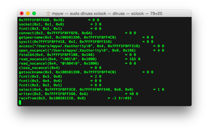 我试图通过使用dtruss来转储系统调用。下面的示例由sudo dtruss xclock表示。其他X11应用程序的行为也是这样的。所有X11应用程序都在recvfrom之后挂起。