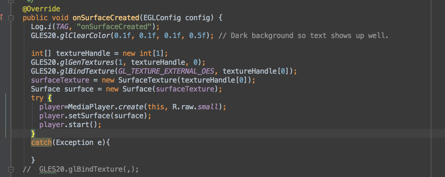 onSurfaceCreated()方法中,我初始化一个纹理并将其绑定到GL,并创建一个与它们相关联的曲面和mediaplayer。