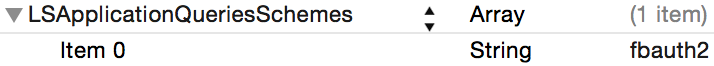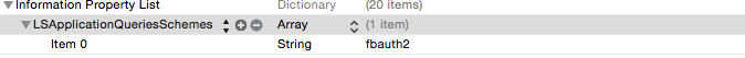 在info.plist中,添加一个带有LSApplicationQueriesSchemes键的行。确保它是array类型的。对于它的唯一元素,添加字符串fbauth2。