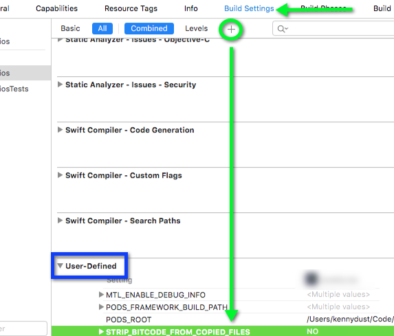 根据M. Pogosskiy的答案,我花了一段时间才找到将STRIP_BITCODE_FROM_COPIED_FILES位设置放在哪里(不太熟悉这些设置)。作为参考,这里有一个例子:
