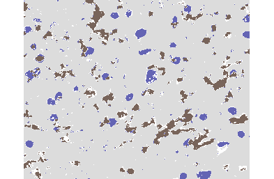围绕蓝色圆圈的黑匣子是我正在寻找的一组数据,特别是它们在图像中的数量以及它们所覆盖的图像的%区域。围绕着合并的蓝色和棕色区域的红色框也是我专门寻找的东西,与上面所需的值相同。最后,图像的棕色区域也是我所要寻找的,但只适用于图像中覆盖的%区域。