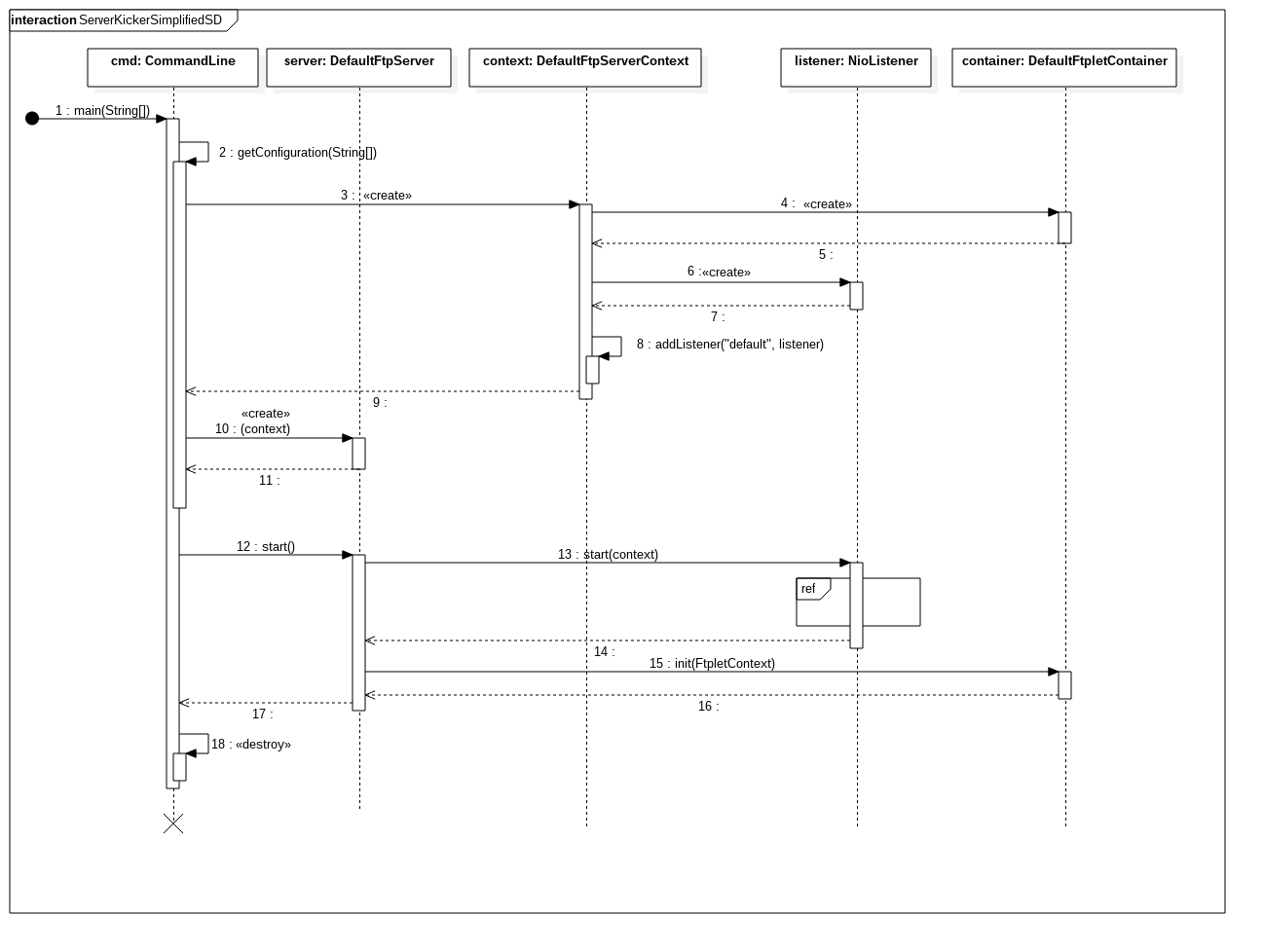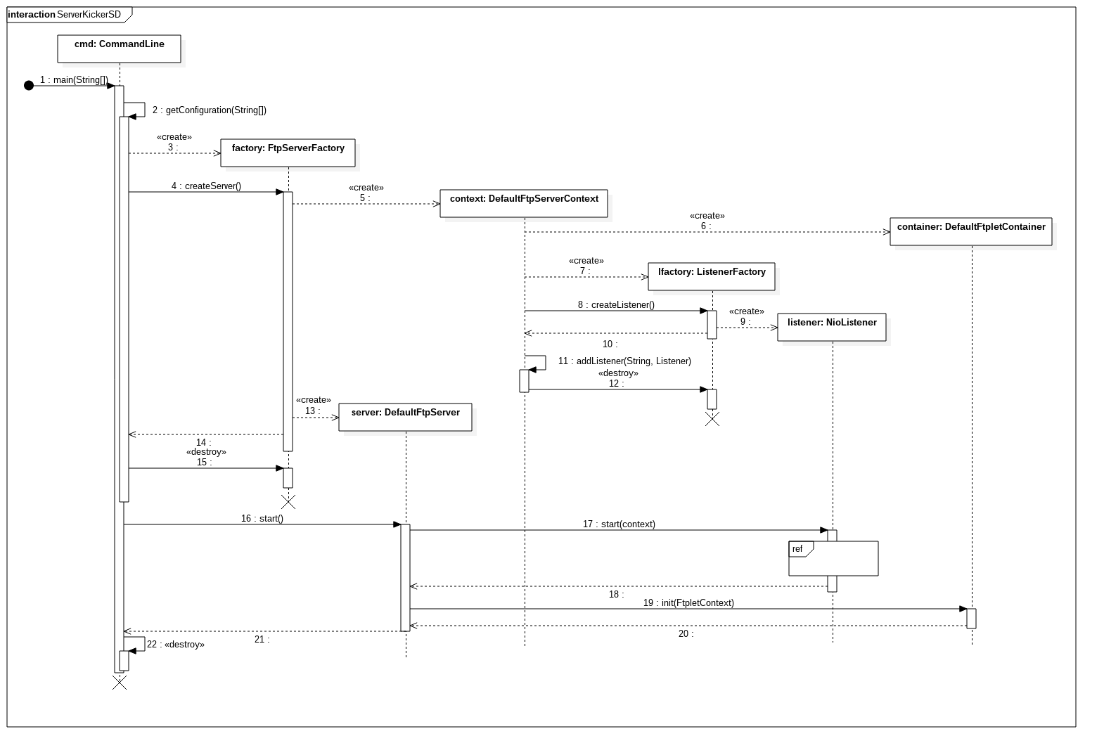 下面的序列图模拟了FTP服务器的初始化,它使用两个工厂(FtpServerFactory和ListenerFactory)来创建所需的对象。不幸的是,交互大大增加了图表的复杂性,而没有增加任何有用的洞察力。