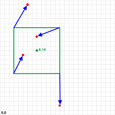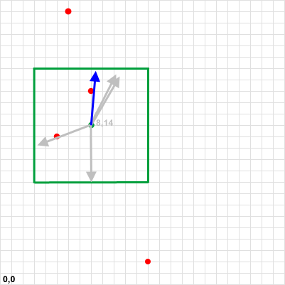 当你把矢量从正方形的一个角画到最近的机器人时,这个矢量显示了方格应该向哪个方向移动,以减少从那个角到它最近的机器人的距离。如果你计算这四个矢量的方向之和(在把它们加起来之前,把它们改变为1),那么在结果的方向上移动方格将减少总距离。