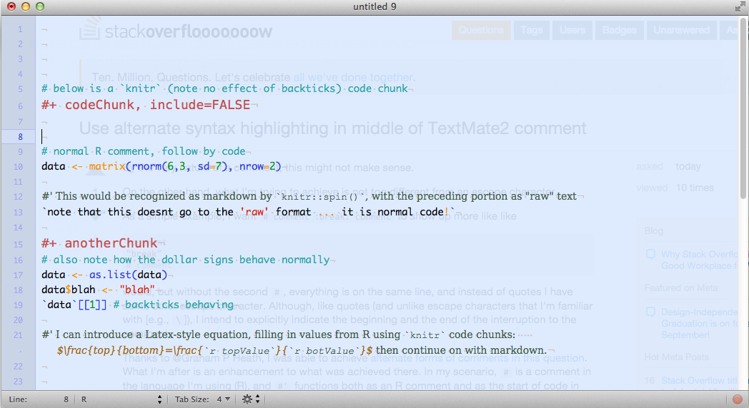 #' I can introduce a Latex-style equation, filling in values from R using `knitr` code chunks: $\frac{top}{bottom}=\frac{`r topValue`}{`r botValue`}$ then continue on with markdown.在进行这些更改之后,下面是TextMate2中的样子: