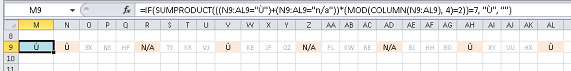 =IF(OR(L9="no", SUMPRODUCT((N9:AL9=TRANSPOSE({"Ù","n/a"}))*NOT(MOD(COLUMN(N:AL)-2, 4)))=7), "Ù", "")https://stackoverflow.com/questions/32130278