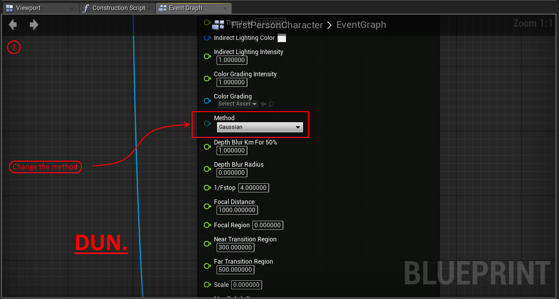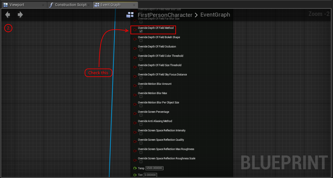 单击“Make PostProcessSettings”中的白色箭头查看所有这些选项,并选中“覆盖字段深度方法”复选框.