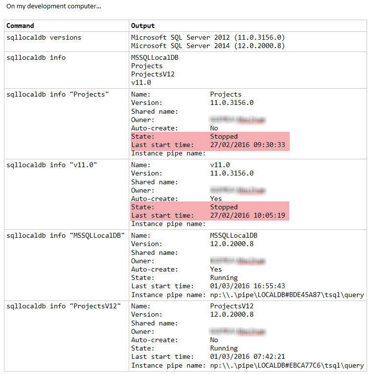 请注意,您可以在计算机上安装多个SqlLocalDB实例,可以通过打开CMD窗口并执行以下命令列出它们