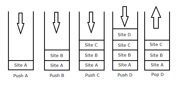 然后,当用户按回按钮时,会弹出顶部的(从尾部移除--用于插入的相同端),这将给出最后一次访问的站点C。因此,先入(即站点A)和last的概念(最后一个进入的是site,它反过来成为第一个被访问的站点)。
