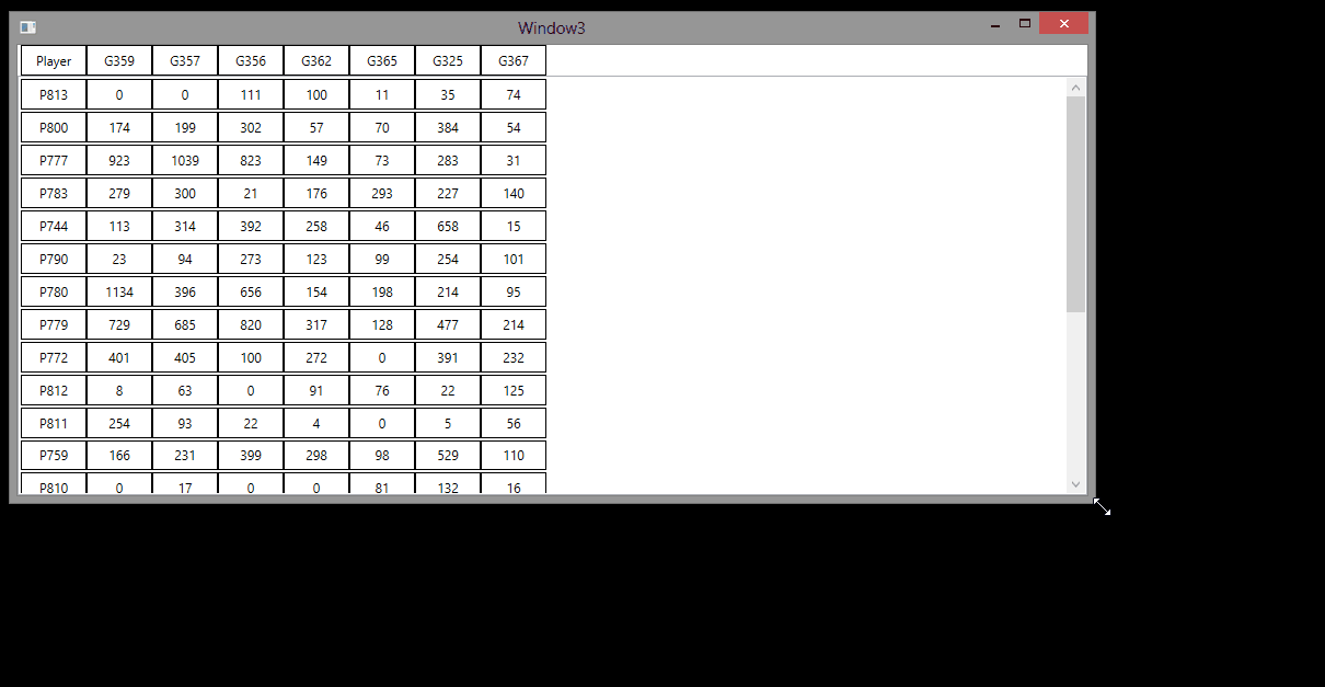 ItemsControl显示顶部的Columns集合(列名)。ListBox显示Rows,每行包含一个单元格作为播放机名称,然后是数字单元格的水平ItemsControl。注意,与winforms的对应程序相比,WPF ListBox实际上是有用的。DataGrid一样支持行选择,只是因为我不断地丢弃和重新创建整个数据集,所以整个选择都不会被维护。我可以在VM中添加一个SelectedRow属性来修复这个问题。https://stackoverflow.com/questions/32169375