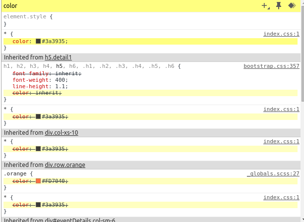 我很难理解为什么我的CSS没有按照我理解特定规则的方式进行样式设计。根据我在网上的解读(包括这台计算器),* (匹配一切)没有特异性,而元素(例如h1、h2等)是第四位的,而类是第三位的。但这不是我在Chrome调试器中看到的。