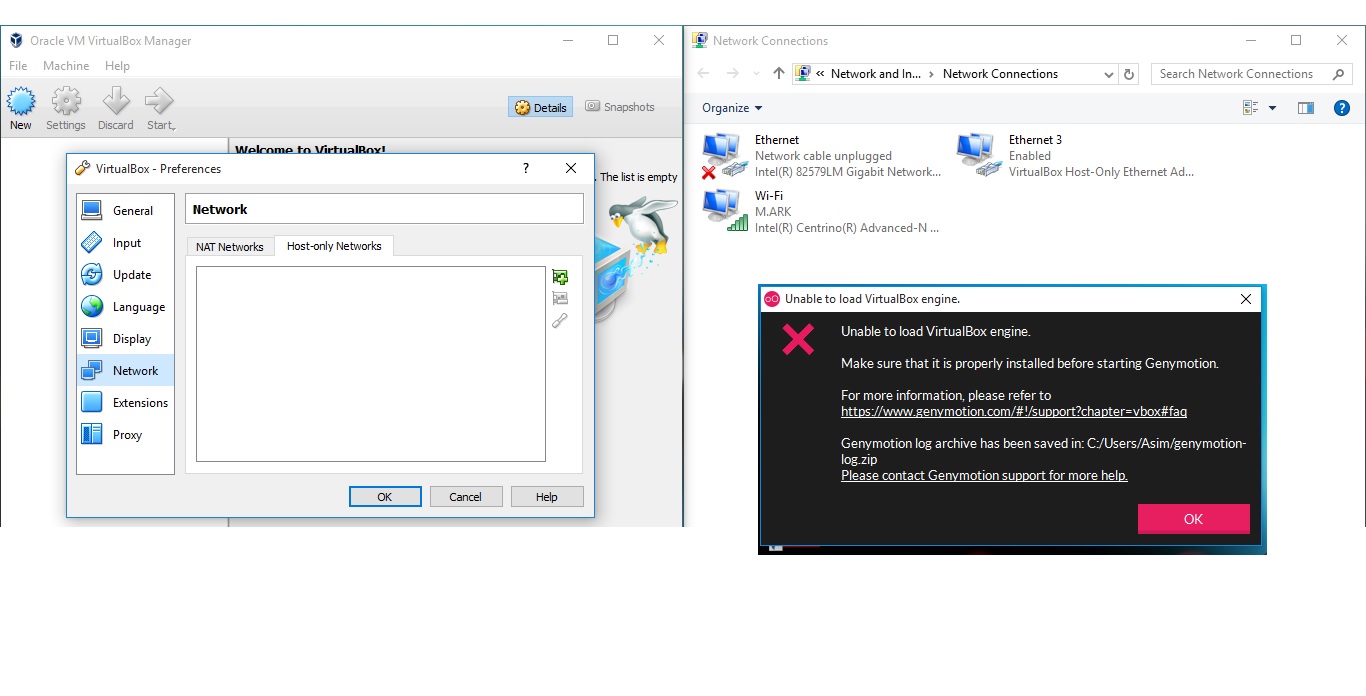 我在互联网上发现的是在windows功能中启用Hyper-V,并重新安装VB主机网络适配器,但注意到对我有用。此外,Virtual也没有显示任何仅限于主机的网络。