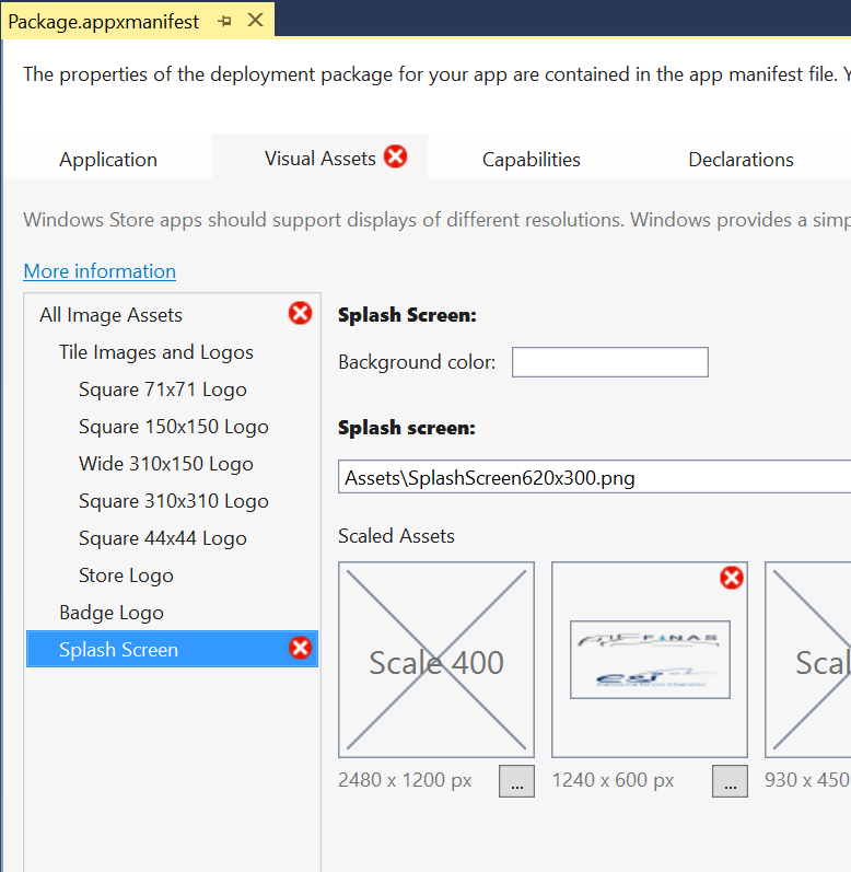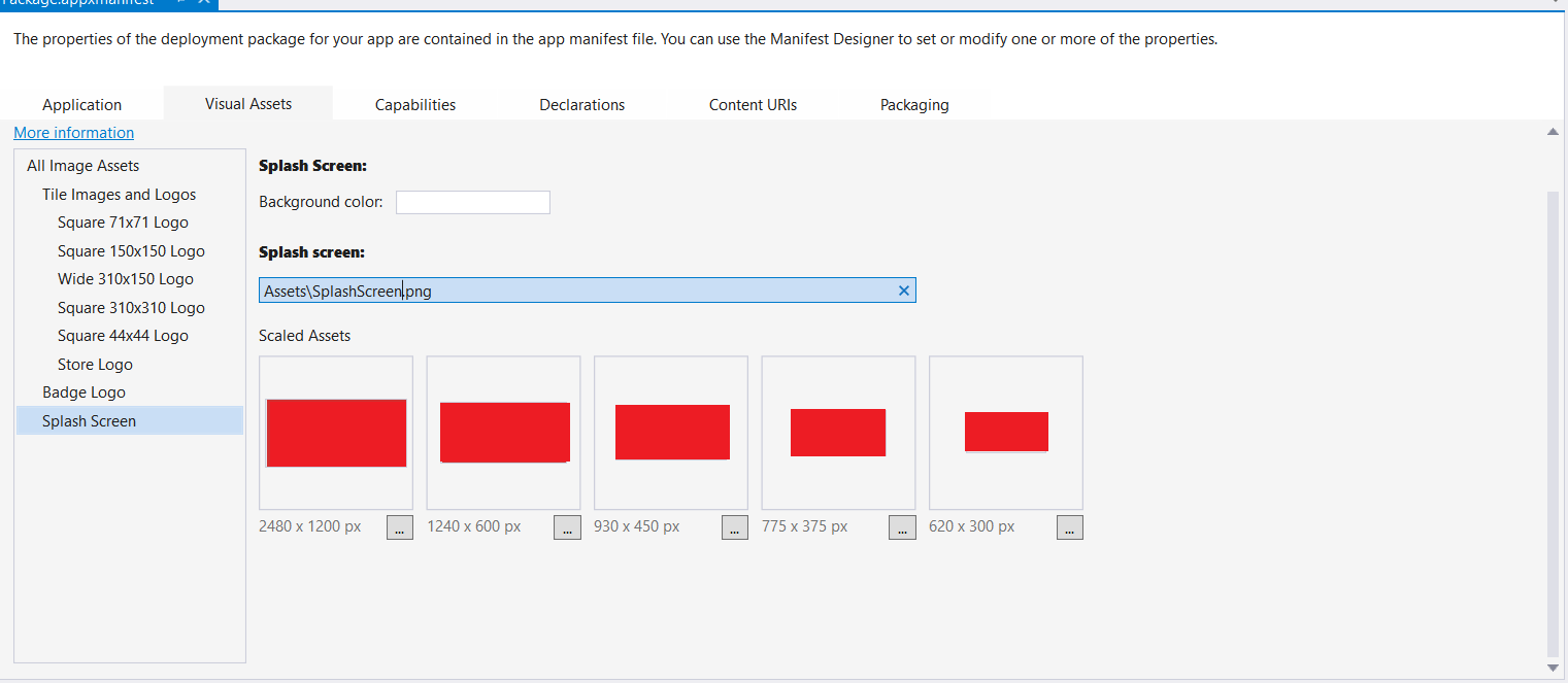 对于Windows应用程序,至少提供2.4x资产;最好全部提供。图像文件资产本身应该具有透明的背景。在应用程序清单中,将SplashScreen@Image属性的值设置为"Assets.png",并为VisualElements@BackgroundColor设置一个值。