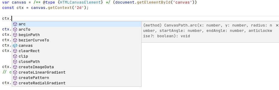 var canvas = /** @type {HTMLCanvasElement} */ (document.querySelector('#canvas'))然后享受基本的智能感知: