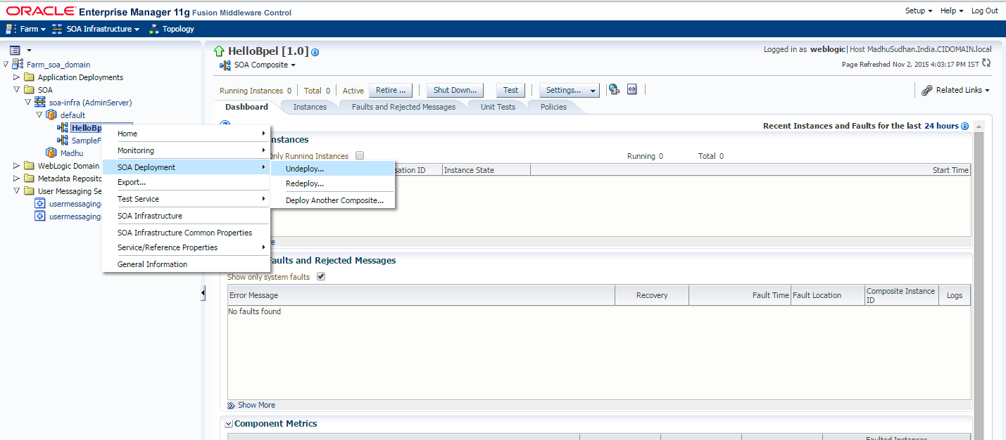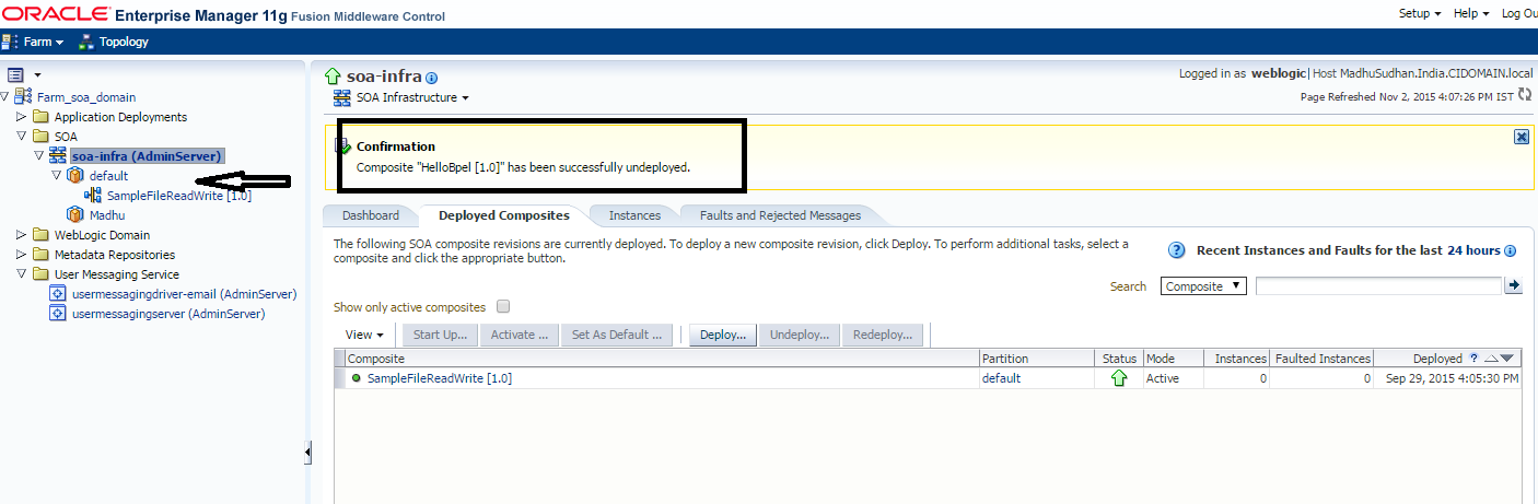 因此,基于上面通过“显示名称缺失”发布的链接,甲骨文为我们提供了Fusion Middleware Control - Enterprise Manager,我们可以使用它来部署/取消部署soa应用程序等等。问题是我无法访问ip:port/em上的Enterprise,因为我在创建域时没有安装它,所以我使用配置向导扩展域。一旦我将“企业管理器”添加到我的域中,我就可以访问ip:port/em并取消部署我的SOA应用程序。