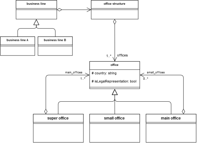 我尝试过:复合模式的叶子办公室和复合法律代表专攻主厅,超级办公室,小办公室。问题:如何表示业务线?
