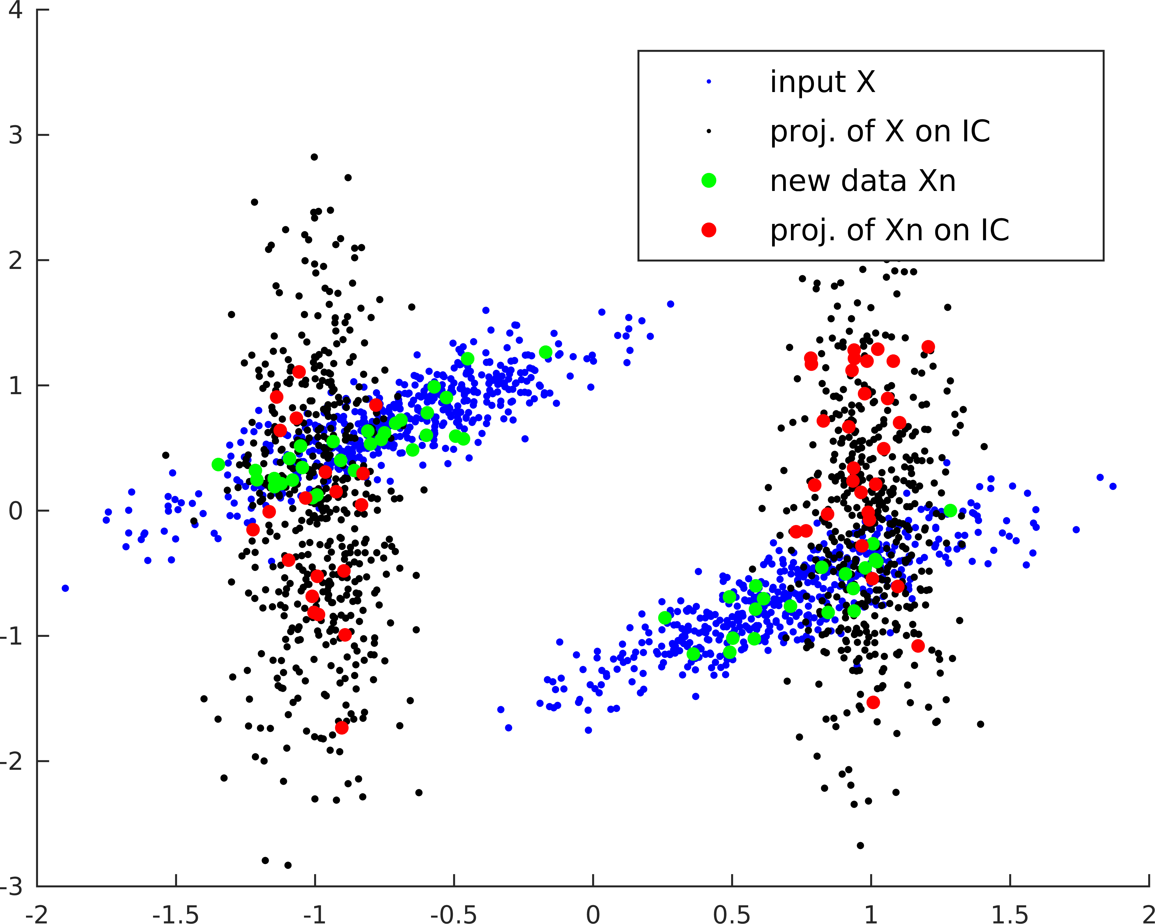 icasig代表数据的来源或输入数据在train_data估计的集成电路上的投影。在这种情况下,发现了k个In,因此192个点由它们的k值表示。icasig已经给出了IC上原始数据的投影。Xn通过Yn = W*Xn投影一组新的点。示例:
