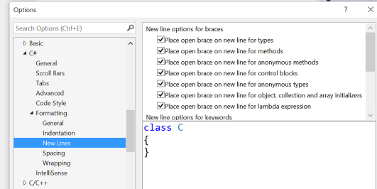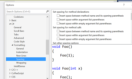然后转到您希望自定义的语言(我正在显示C#)并单击格式化。在这里,你会发现选择,我已经扩大了空格一,根据标题的你的问题。