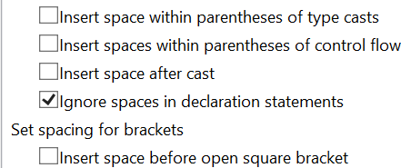 管理自动格式化的唯一方法是使用这些设置。您也可以使用regex与查找和替换从文件中删除空间,但要小心。除了这些技巧来定制您的自动格式化,减少VS过程的自动格式化和手动自动格式化,这是我所能想到的。