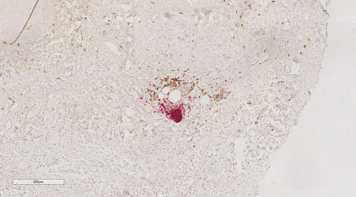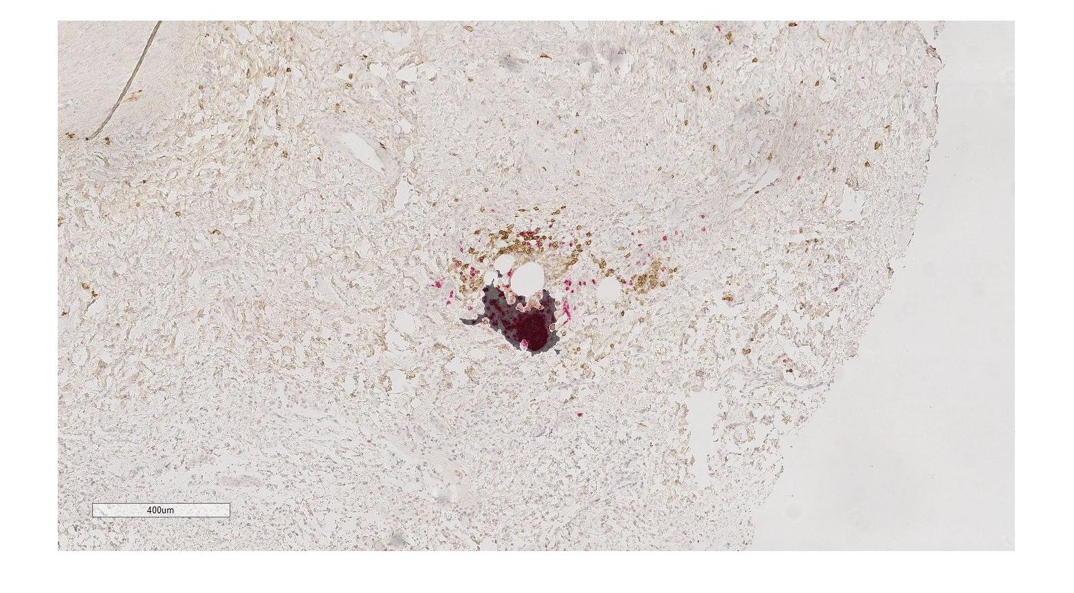 为了根据颜色将组织学幻灯片分成几个层次,我修改了一些广泛分布的代码(1),这些代码可以通过OpenCV的社区获得。我们的染色程序标记不同类型的组织横断面不同颜色(B细胞为红色,巨噬细胞为棕色,背景珠心有蓝色)。