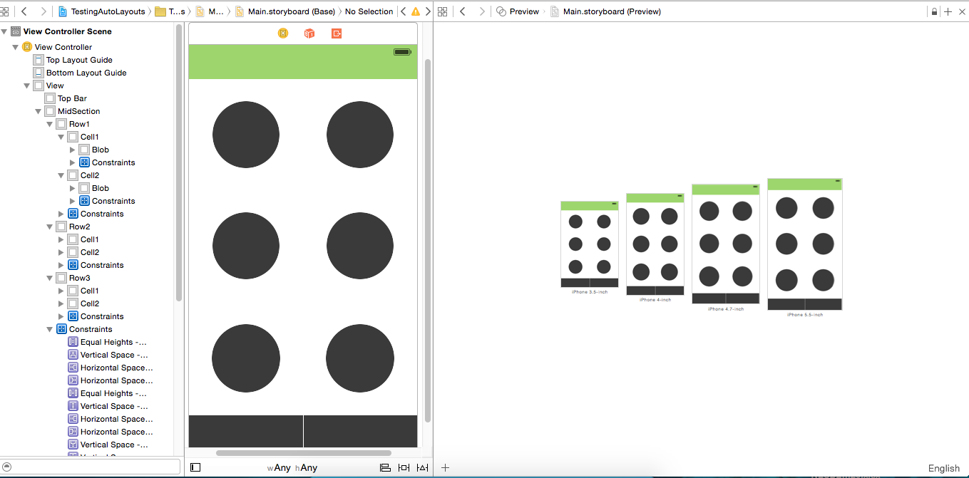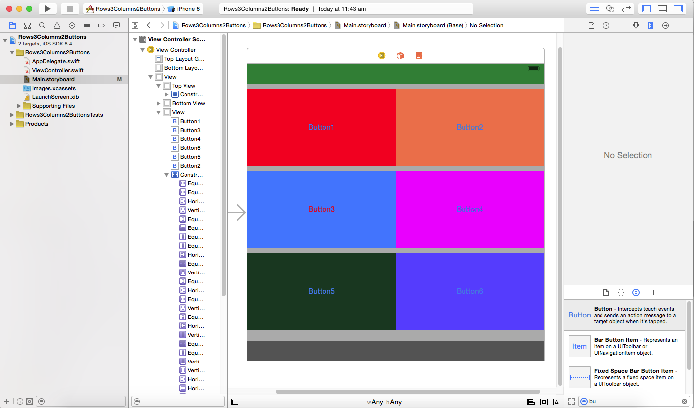 我需要帮助设计3行和2列on按钮在故事板上的单一视图控制器的布局。它适合所有的iPhone设备,如4s,5,6和6+。我不知道如何使用这些约束。请引导我这样做。这是我想要的像这样的示例图像