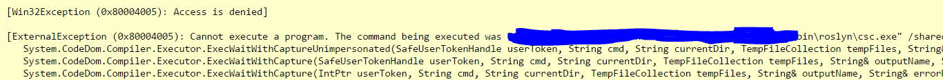 IIS似乎试图执行roslyn\csc.exe,但我的用户帐户没有权限这样做。对于以前版本的Visual,此错误不会出现。
