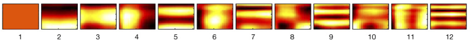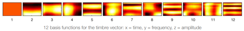 音色是区分不同类型乐器或声音的音符或声音的质量。它是一个复杂的概念,也被称为声音的颜色,纹理或音调质量,是从一个片段的频谱-时间表面的形状,独立于音高和响度。Echo Nest Analyzer的音色特性是一个向量,包含12个无界值,大致以0为中心。这些值是光谱表面的高级抽象,按重要程度排列。然而,为了完整起见,第一维表示片段的平均响度;第二维度强调亮度;第三维度与声音的平整度更密切相关;第四维度表示攻击更强的声音;等等。参见下面表示12个基函数(即模板段)的图像。段的实际音色最好描述为这12个基函数的线性组合,按系数值加权: timbre = c1 x b1 + c2 x b2 +.+ c12 x b12,其中c1 to c12表示12个系数,b1 to b12表示12个基函数,如下所示。音色向量最好是互相比较使用。