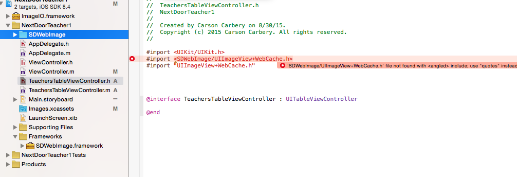 #import "UIImageView+WebCache.h"我得到了一个在# UIImageView+WebCache.h上找不到的文件,然后如果我按照建议将它更改为" SDWebImage /UIImageView+WebCache.h“,我会得到一个在:#import SDWebImage上找不到的文件,尽管在我打开项目中的SDWebImage文件夹时可以清楚地看到它!我猜想,当我尝试使用sd_setImageWithUrl方法时,这些错误也会导致一个未找到的错误。