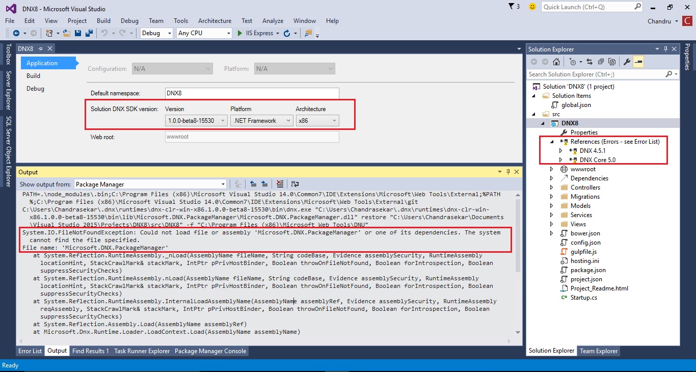 在输出窗口中,您可以看到错误“无法加载'Microsoft.DNX.PackageManager'",根据这个公告,它已被重命名为'Microsoft.Dnx.Tooling‘,所以我的问题是,为什么新的DNX 8版本仍然依赖于这个删除或重命名的DLL 'Microsoft.DNX.PackageManager’
