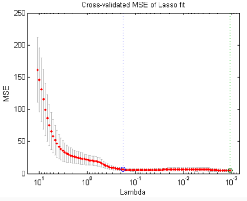 绿色圆圈和虚线定位Lambda时,交叉验证误差最小.蓝色圆和虚线定位点的交叉验证误差最小加上一个标准差。