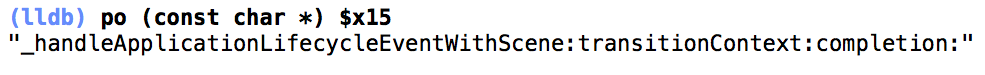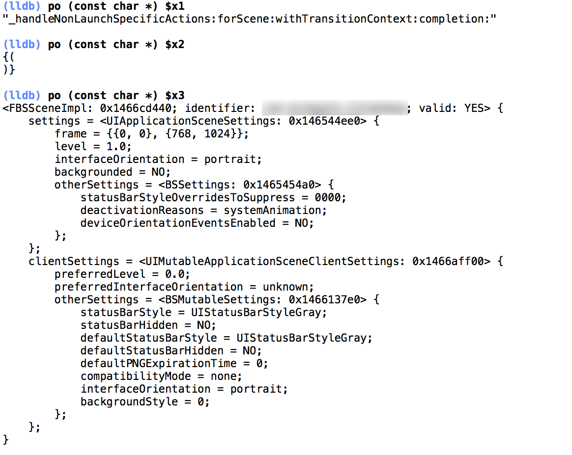 但是,我们还是想知道这个行动是什么。因此,我在-[UIApplication _handleNonLaunchSpecificActions:forScene:withTransitionContext:completion]上放置了一个断点,并开始打印寄存器值,并找到了一个名为FBSceneImpl的类,它包含大量关于我的应用程序的信息: