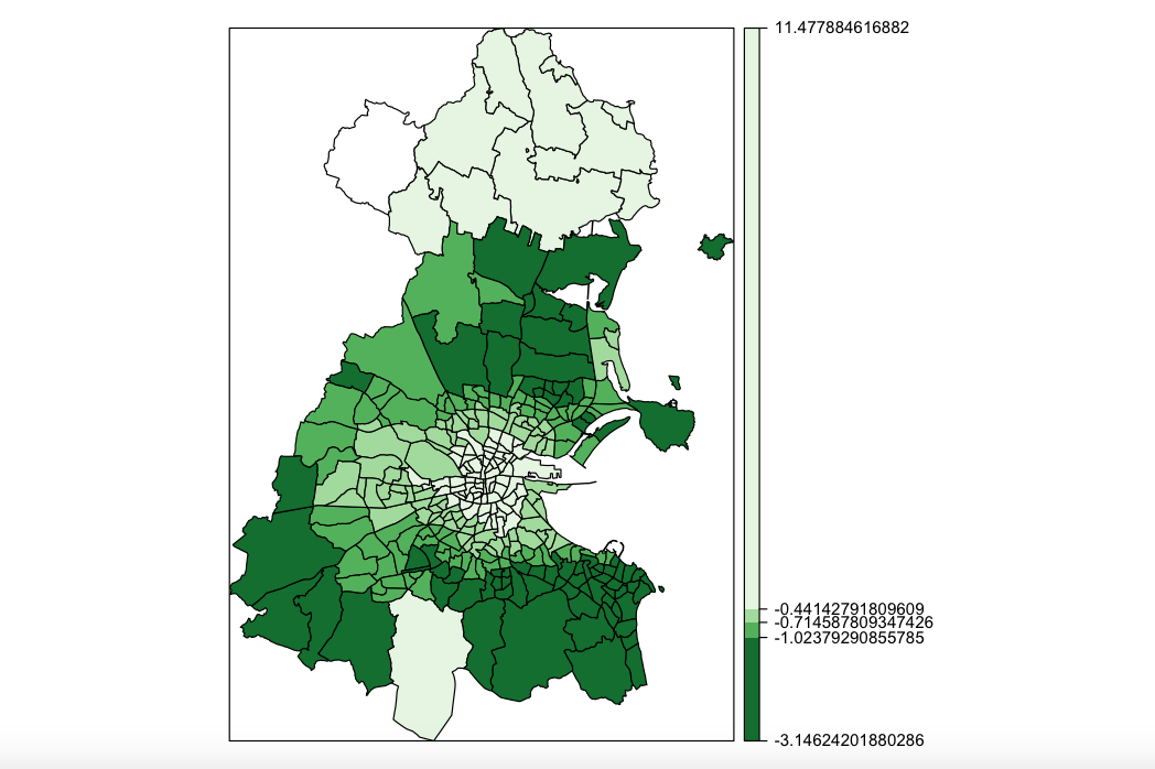 spplot(gwr.res$SDF, "Unempl", cuts = 4, at = c(fivenum(gwr.res$SDF$Unempl)), col.regions = Greens,