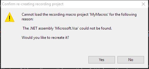 我总是在中使用宏。它们是我日常工作流程的一部分。但是,在从Windows 7升级到Windows 10之后,宏现在就坏了。每当我尝试做任何与宏相关的事情时,我都会得到以下消息:“找不到.NET程序集'Microsoft.Vsa‘。