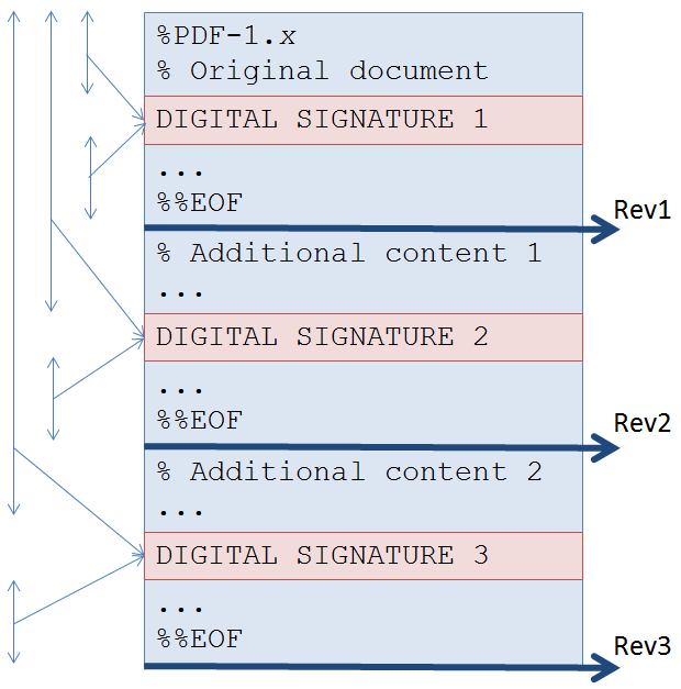 第一个签名涵盖第1版,但不包括整个文档。第二个签名包括第2版,包括第1版,但不包括整个文件。第三份签名涵盖第三版,包括第一版和第二版,还包括整个文件。