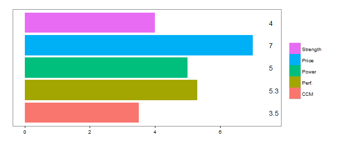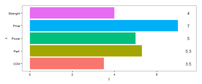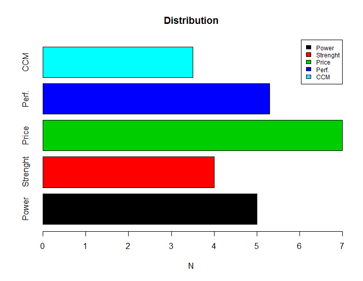 names(a1)<-c(as.character(c("Power", "Strenght", "Price", "Perf.", "CCM")))而这个代码可以生成barplot