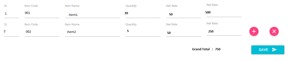 txt_box='<div id="input_'+id+'" class="row"><div class="input-field col s1"><input type="text" name="Sr_'+id+'" value="'+id+'" ><label for="SrNo" class="active">SrNo</label></div><div class="input-field col s2"><input id="item_code" type="text" name="item_code_'+id+'"><label for="item_code" class="active">Item Code</label></div><div class="input-field col s2"><input id="item_name" type="text" name="item_name_'+id+'"><label for="item_name" class="active">Item Name</label></div><div class="input-field col s1"><input id="qty" type="text" name="quantity_'+id+'"><label for="quantity" class="active">Quantity</label></div><div class="input-field col s1"><input type="text" name="net_rate_'+id+'" ><label for="net_rate" class="active">Net Rate</label></div><div class="input-field col s1"><input type="text" name="tax_'+id+'" ><label for="tax"class="active">tax</label></div><div class="input-field col s1"><input type="text" name="Gross_Rate_'+id+'"><label for="Gross Rate" class="active">Gross Rate</label></div><div class="input-field col s1"><input type="text" name="total_'+id+'"><label for="total" class="active">total</label></div><div class="input-field col s2"><a href="#" class="btn-floating waves-effect waves-light add "><i class="mdi-content-add">Add</i></a></div><a href="#" class="btn-floating waves-effect waves-light remove "><i class="mdi-content-clear">Remove</i></a></div>';