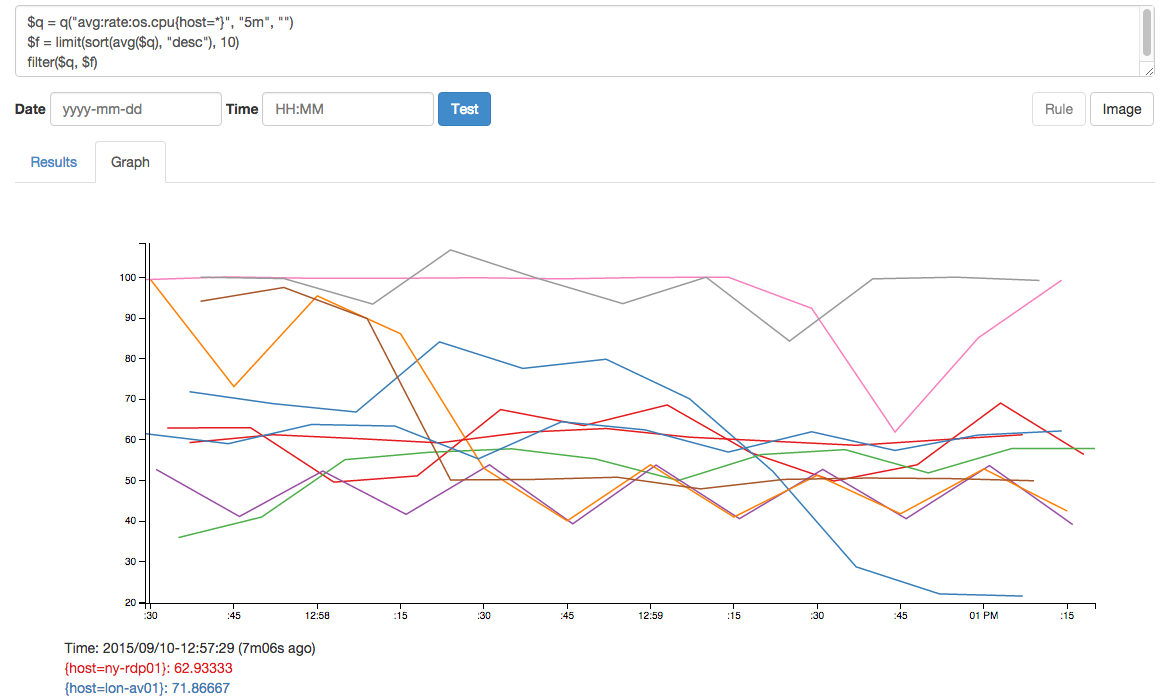 我需要在主机上创建一个内存使用情况的TOP10表,包括一个图表。我可以通过使用limit($query,10)在表达式中这样做,因此它对警报和表很好,但是我在限制此图上的主机时遇到了问题。极限返回一个数字,我需要一个序列才能绘制它。在Bosun中可以限制图中主机的数量吗?