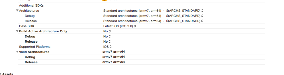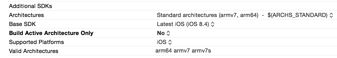 正如其他问题/答案中所建议的那样,我已经将我的应用程序提升到推荐设置,设置标准体系结构和有效体系结构以包括arm64 (见下文)。