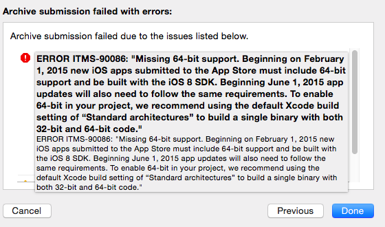 iTunes存储操作失败。少了64位的支持。从2015年2月1日开始,上传到apps的新iOS应用程序必须包括64位支持,并且必须使用Xcode 6或更高版本中包含的iOS 8 SDK构建。为了在您的项目中启用64位,我们建议使用默认的Xcode构建设置“标准体系结构”来构建一个包含32位和64-.