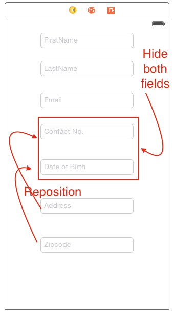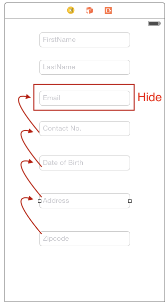 现在我的问题是,如果不需要任何字段,那么应该重新定位textfields,并且在我的应用程序中使用自动布局。我正在隐藏电子邮件文本框,那么如何设置下一个文本框的位置,如联系人号、出生日期等?