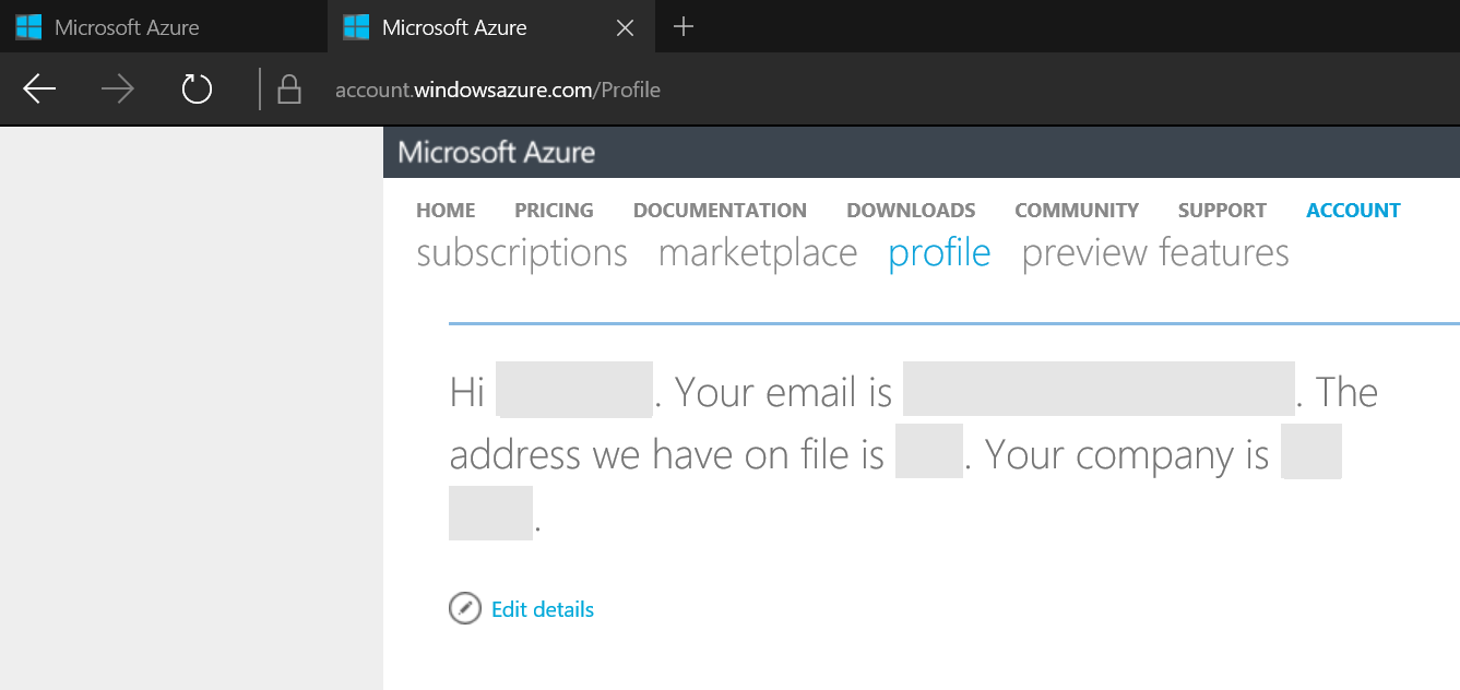 登录Azure门户。在右上角,点击你的用户名,然后选择“查看我的账单”。这将打开account.windowsazure.com。选择侧写。你的国家代码会在那里。
