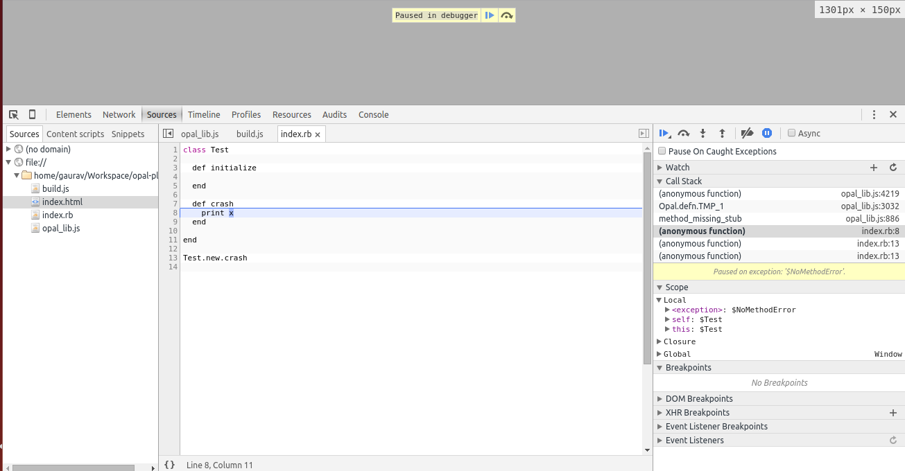 ruby builder.rb这将生成编译好的javascript文件opal_lib.js和build.js,这些文件被我们的index.html文件引用。现在只需在浏览器中打开index.html即可。您将得到一个完整的调用堆栈和源视图: