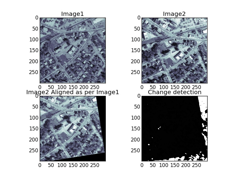 Image2已按照Image1共同注册,因此可以执行更改检测。这将导致对齐图像(第3张)右侧和底部的黑色部分,因为该部分在Image2中不可用。或者我们可以说,与Image2(由于注册)相比,对齐图像中的信息丢失了。
