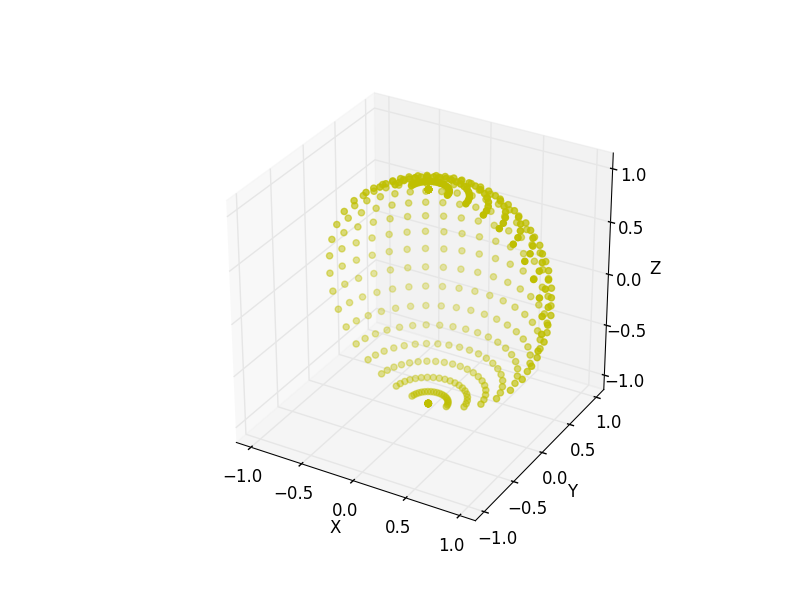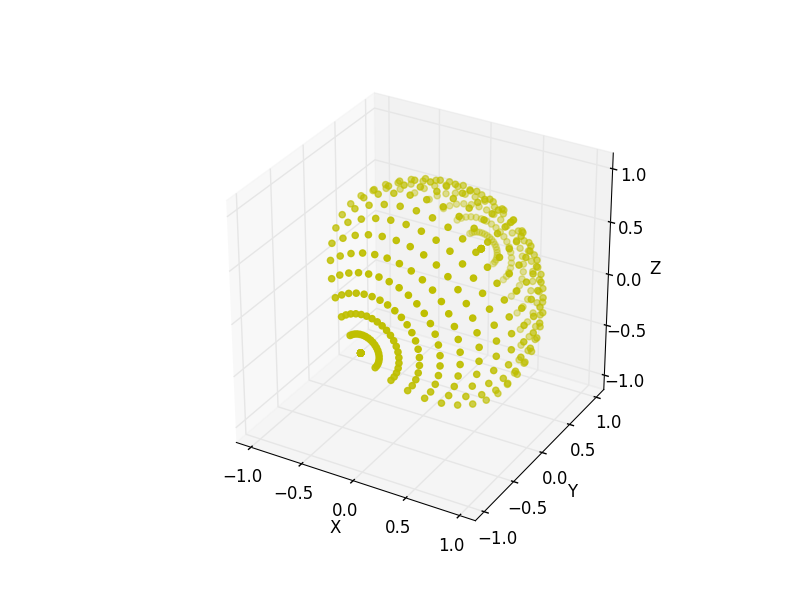 artist = ax.scatter(x, y, z, marker='o', color='y')